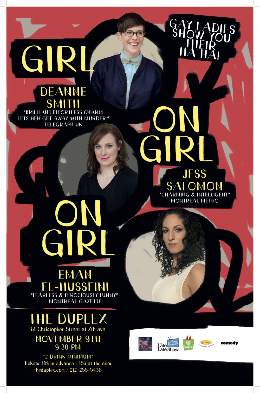Jess Salomon, the show’s host, has been touring Canadian and American comedy clubs, appeared in the Just for Laughs Festival, San Francisco Sketchfest, the Laughing Skull Festival and the CinderBlock Festival. She also recently taped a television Gala for CBC (that’s like the Canadian BBC!). She is now a proud Green Card holder and new NYC resident which she got by marrying Muslim-Palestinian-Canadian comedian, Eman El-Husseini. Guys, Eman wasn’t even gay before! Again, Jess has been very busy.